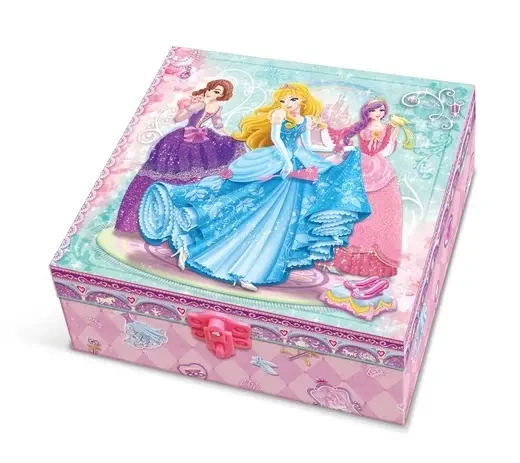 Komplet umieszczony jest w dekoracyjnym pudle z dwiema półkami, które można rozwijać na boki, pod którymi można schować pamiętnik.