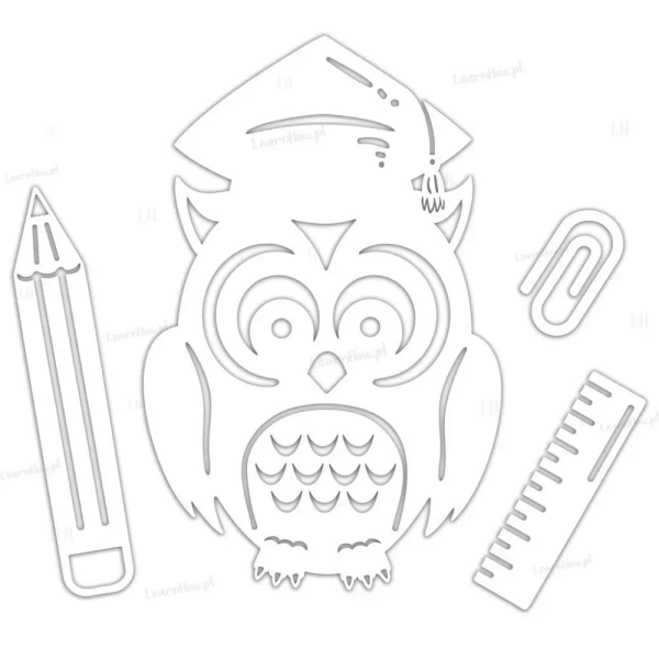 W skład zestawu wchodzą cztery duże ozdoby - Duża Sowa w birecie, kredka, linijka i spinacz.
