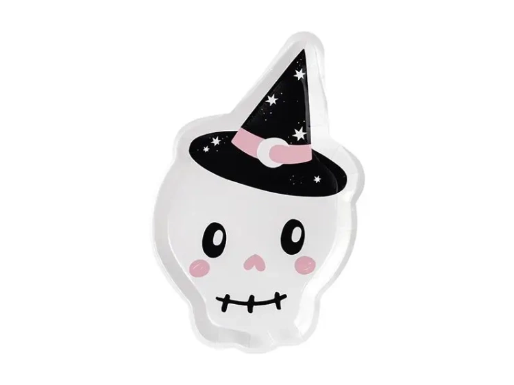 Zestaw papierowych talerzyków o wyjątkowym designie w formie czaszki. Prezentują różne kolory i ich rozmiar to około 18 x 27 cm. W jednym opakowaniu znajdują się 6 sztuk.