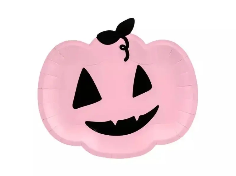 Są to papierowe talerzyki Dynia o różowym odcieniu, które dodatkowo ozdobione są czarnym wzorem. Ich rozmiary to mniej więcej 25 x 22 cm. W jednym zestawie znajduje się 6 sztuk.