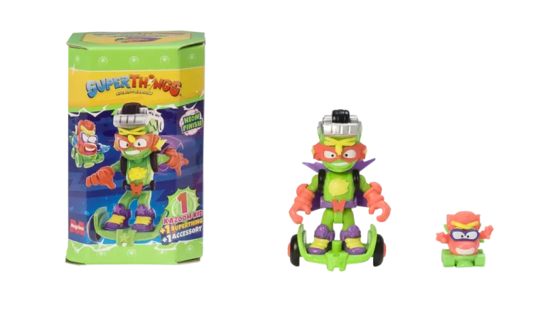 Kazoom Kids SuperThings Neon Power to nowa generacja bohaterskich i zbrodniczych postaci przeznaczonych do walki o znaczenie w mieście. Przemienione przez niegodziwego Kazoom Blasta, ich zdolności zyskały dodatkową moc dzięki neonowej sile Color Flasha i osiągnęły zupełnie nowy wymiar. W rezultacie, ich ramiona i nogi zyskały ruchomość, co pozwala im na siedzenie. Grupa składa się z 6 nowych Kazoom Kids, każdy z specjalnym neonowym wykończeniem. Czy będą w stanie stawić czoło wyzwaniom i przejąć kontrolę nad Kaboom City? Każde pudełko zawiera jeden Kazoom Kids, jeden SuperThing oraz listę kontrolną. Produkt przeznaczony jest dla dzieci powyżej trzech lat, a każdy zestaw składa się z sześciu sztuk.EAN: 8431618023105