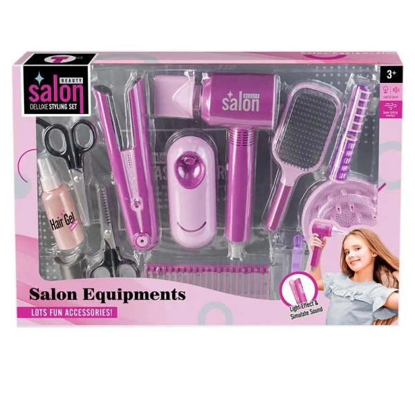 W skład zestawu wchodzi suszarka do włosów wyposażona w dwie końcówki do wymiany oraz prostownica na baterie. Ponadto, w zestawie znajdują się dodatkowe akcesoria takie jak: szczotka, grzebień, dwie pary nożyczek, dwie spinki i dwa wałki. Do zestawu dołączona jest również plastikowa buteleczka.