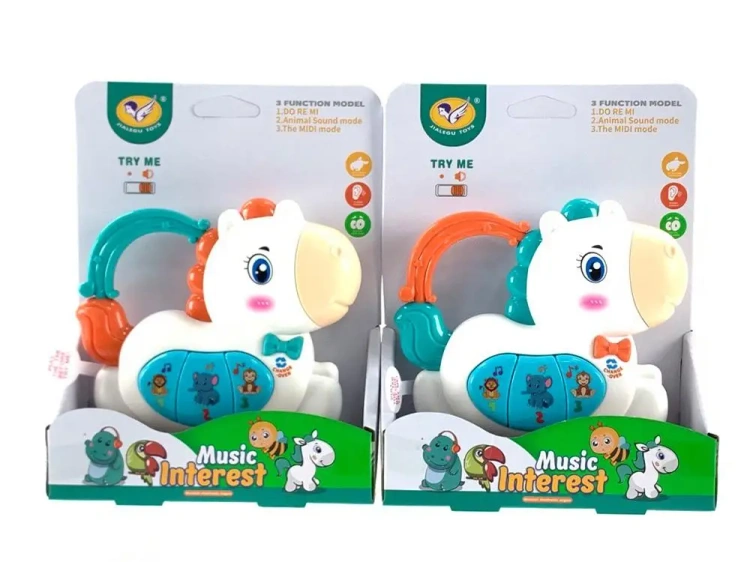 Nasz muzyczny konik oferowany jest w dwóch atrakcyjnych wersjach kolorystycznych. Koncepcja zabawki obejmuje efekty dźwiękowe takie jak do, re, mi oraz symulowane odgłosy zwierzęce. Zabawka jest wyposażona w możliwość regulacji głośności - od cichego dźwięku do głośnego. Urządzenie ma zapewnione zasilanie, na które składa się 2 baterie typu AAA (dołączone do zestawu).