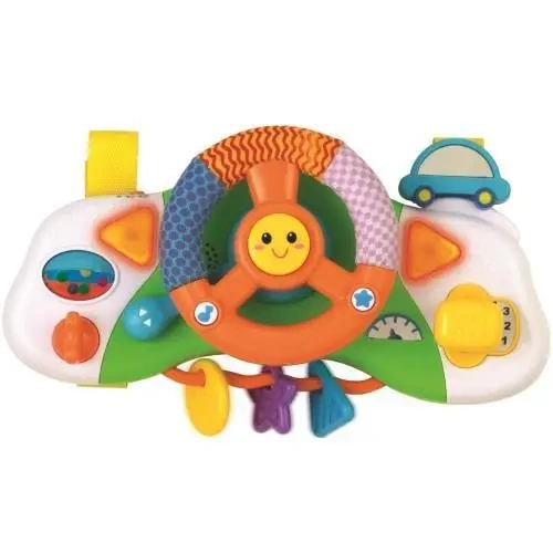 • Umiejętności manualne poprzez kręcenie kolorowym walcem i przesuwanie plastikowych kształtów o różnorodnych fakturach, które dodatkowo stymulują zmysł dotyku. Część kierownicy jest pokryta materiałem, co ma dodatkowe znaczenie dla rozwoju sensorycznego dziecka.