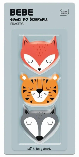 Oto zestaw składający się z trzech gumek do mazania, które wytworzone są w formie sympatycznych zwierzątek z linii produktów BEBE Friends. Są one nie tylko atrakcyjne pod względem estetycznym, ale także niezwykle skuteczne – usuwają wszelkiego rodzaju ołówkowe ślady, nie pozostawiając po sobie żadnych pozostałości.