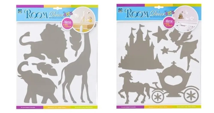 Kolekcja naklejek na ścianę z motywem luster zawiera różne wzory, które są losowo wysyłane dla każdego zamówienia. W skład zestawu wchodzą motywy z Karola i różnych zwierząt.