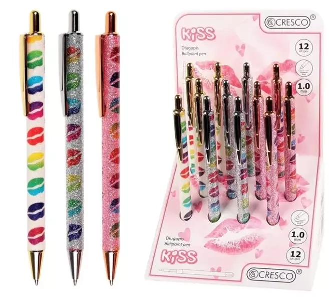 Zamówienie obejmuje opakowanie zbiorcze zawierające 12 długopisów marki KISS. Każdy z nich jest wyposażony w wymienny wkład o niebieskim kolorze, który charakteryzuje się grubością linii na poziomie 1mm. Jest to model typu zenith.