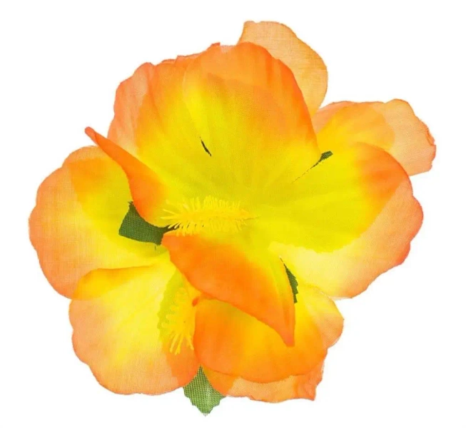 Prezentujemy Ci dużą spinkę hawajską o długości 7,5 cm. Jej przekątna to aż 12 cm, co czyni ją niezwykle efektowną i pojemną. Spinka charakteryzuje się kwiatowym motywem, wykonanym w przepięknym pomarańczowo-żółtym kolorze, z zielonymi dodatkami w postaci listków.
