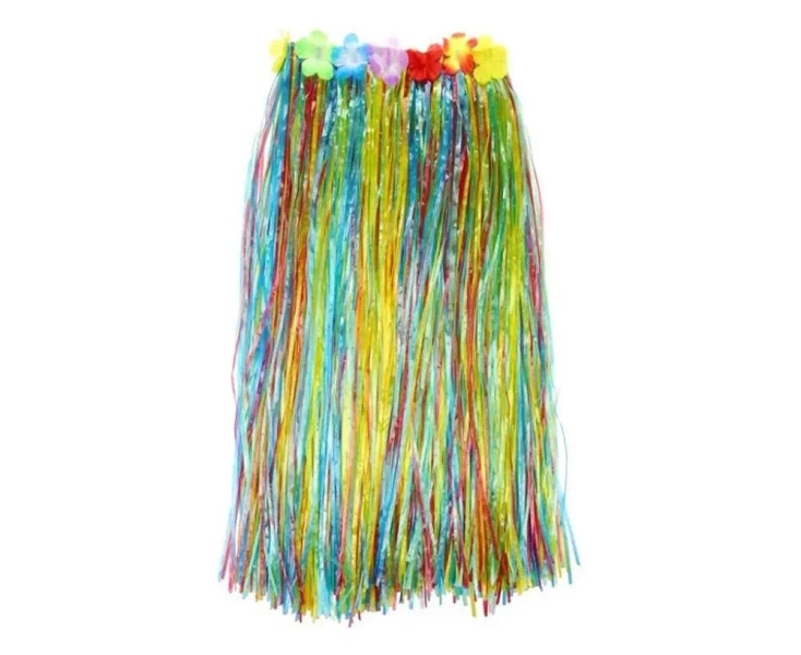 Przedstawiamy uniwersalną, wielokolorową spódnicę w stylu hawajskim. Jej długość to 75 cm, natomiast obwód bez rozciągania wynosi 63 cm. Wykonana jest z folii, co dodaje jej charakterystycznego blasku. Charakteryzuje się elastycznym pasem, który ozdobiony jest mnóstwem jaskrawych kwiatów.