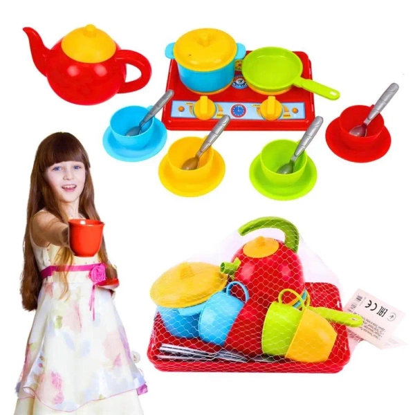 Tu jest zabawkowy komplet do przyrządzania posiłków, który zawiera kuchenkę oraz zestaw naczyń.