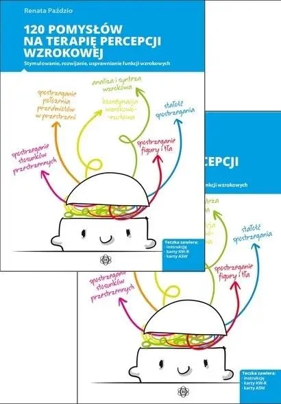 Publikacja 120 pomysłów na terapię percepcji wzrokowej to narzędzie pracy wydane w formie 2 teczek terapeutycznych. Teczki zawierają 120 ćwiczeń, a 320 kart pracy (ponieważ jednemu ćwiczeniu przypisanych jest np. 56 kart pracy). Zadania służą stymulacji, rozwijaniu i usprawnianiu percepcji wzrokowej w zakresie: