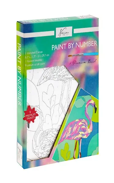 W skład zestawu wchodzi płótno z naniesionym wydrukiem kolorowego flaminga o wymiarach 33,5 × 23,8 cm, na którym widnieją porządki numeryczne.