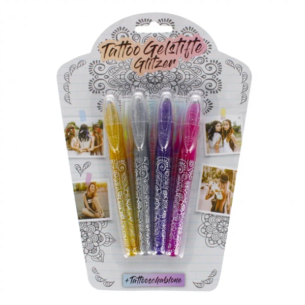 To nie jest zwykły zestaw piśmienniczy! Mamy tu dla Ciebie komplet 4 lśniących żelowych długopisów i wzornik do tworzenia tatuażu, z pomocą którego możesz odsłonić swoje artystyczne talenty i stworzyć na swojej skórze oryginalne rysunki.