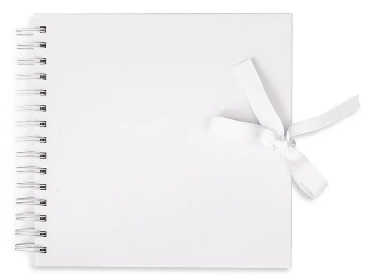 Format albumu to 20,5 x 20,5cm kwadrat, spięty na sprężynę i zawiązany na biały kolorystycznie wstążeczką.