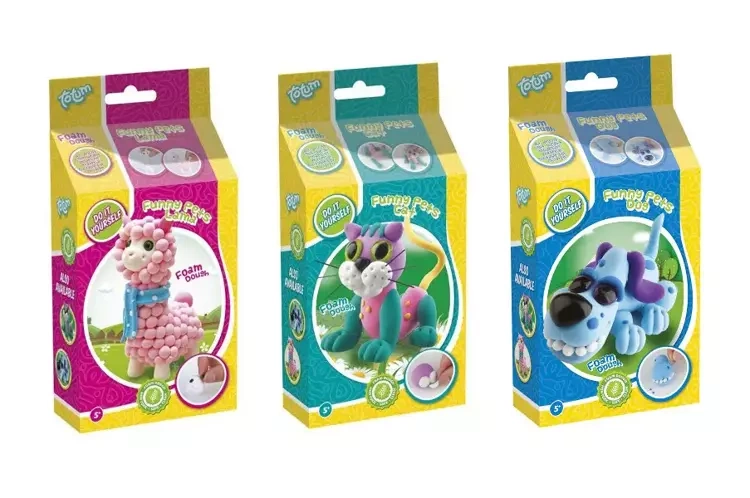 Zrób zabawne zwierzątko z ciasta piankowego za pomocą zestawu Do It Yourself Funny Pets Foam Dough firmy Totum. Foam Dough to suchy na powietrzu i lekki materiał modelarski o pięknych jasnych kolorach, bezpieczny i odpowiedni dla dzieci
