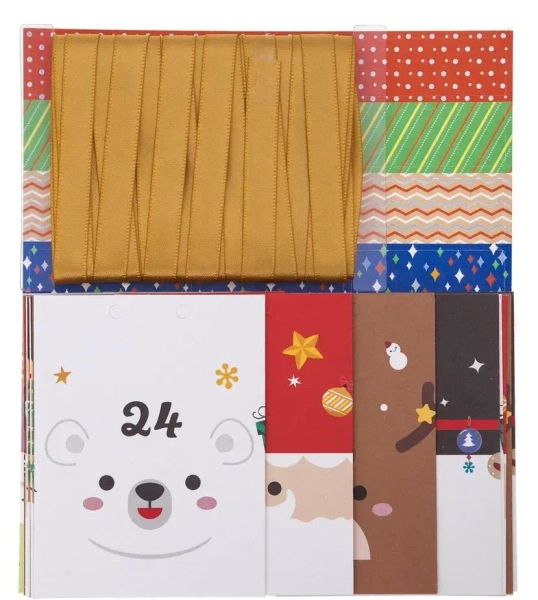 W zestawie otrzymasz wszystko, co potrzebne do złożenia kalendarza adwentowego: 24 urocze pudełeczka z różnymi motywami, takimi jak Święty Mikołaj, renifery, bałwanki czy misie polarne, kolorowe, ozdobne naklejki do zabezpieczenia zawartości oraz złotą wstążkę, którą można wykorzystać do stworzenia zawieszek lub przewleczenia przez wszystkie pudełeczka, aby stworzyć wiszący kalendarz adwentowy.