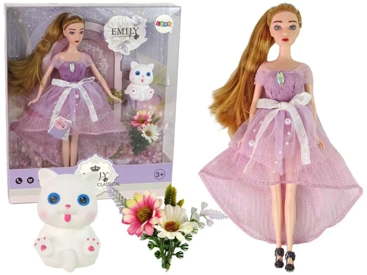 Zestaw lalki dla dzieci: Emily z długimi włosami i białym kotkiem