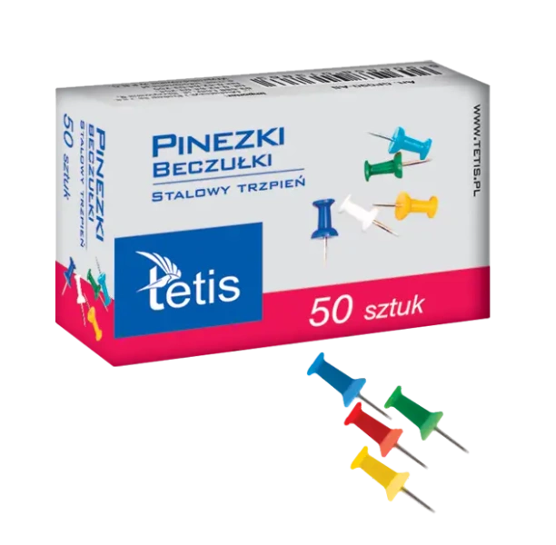 Wykonane ze stali nierdzewnej posiadają trzpień, natomiast główki są z kolorowego plastiku. W zestawie jest 50 sztuk.