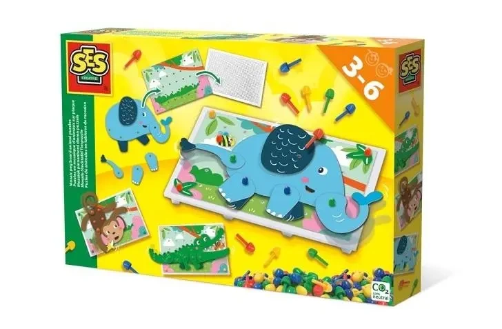 Kreatywnie spędzisz czas z uroczymi zwierzętami z naszego zestawu. Korzystając z 100 kolorowych szpilek, możesz przytwierdzać różnorodne elementy do obrazka przedstawiającego scenerię dżungli.