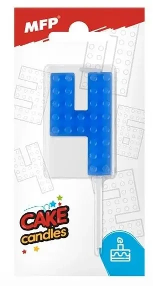 Niebieska świeczka urodzinowa, stylizowana na klocki, z cyfrą 4