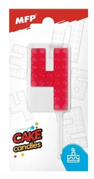 Prezentujemy Państwu unikalną świeczkę urodzinową zdobioną klockami, ułożonymi w formie cyfry 4. Tym razem jednak, tematyczne klocki zostały utrzymane w intensywnym, czerwonym kolorze.