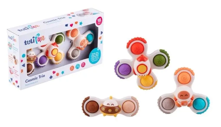 "Kosmiczne Trio" od Dumel to zestaw trzech zabawek wypełnionych kinestetycznymi atrakcjami! Są one specjalnie zaprojektowane, aby ożywić wzrok dzieci dzięki barwnym, interaktywnym elementom. Wrażenia dotykowe to kolejny aspekt, który zachęci maluchy do zabawy, jak również klikające kuleczki do wciskania, które są idealne dla rozwijania zmysłu słuchu.