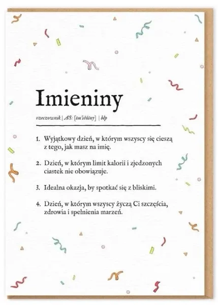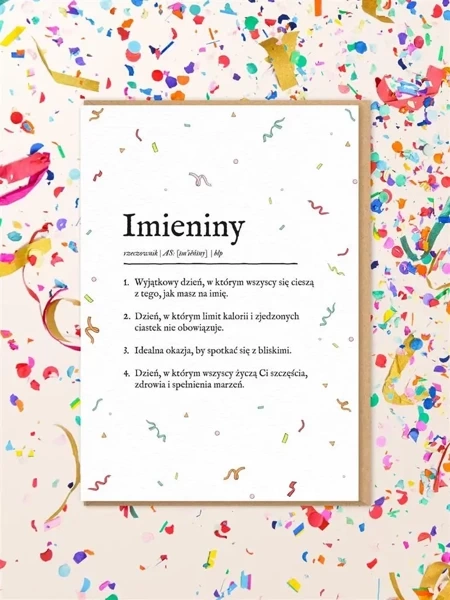 Imieniny – szczególny czas, kiedy wszyscy dookoła celebrują Twoje imię. To moment, kiedy nie musisz liczyć kalorii i możesz zjeść ile tylko chcesz ciastek. Często stanowi to idealny powód do spędzenia czasu z bliskimi oraz otrzymania mnóstwa życzeń zdrowia, szczęścia i spełnienia marzeń. Prezent na ten wyjątkowy dzień? Oto odpowiedź: unikalna kartka imieninowa o nazwie "Definicja Imienin". Jest to doskonały pomysł na prezent imieninowy dla osób, które są Ci najbliższe - mamy, babci, cioci, czy przyjaciela.