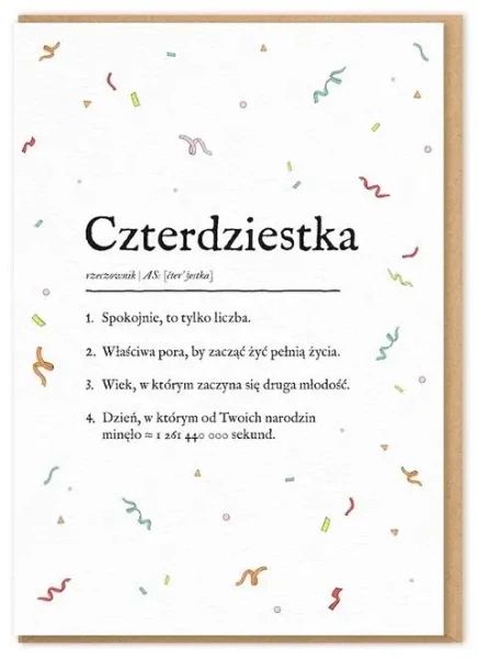 Kartka urodzinowa "Definicja Czterdziestki", dołączona do zestawu z kopertą, jest pusta w środku i czeka na twoje życzenia. Wydrukowana na papierze ekologicznym, można ją wypełnić osobistą notatką, bezpośrednio od serca. To wyjątkowy prezent urodzinowy, który przyniesie uśmiech na twarz bliskiej osoby obchodzącej czterdziestkę.