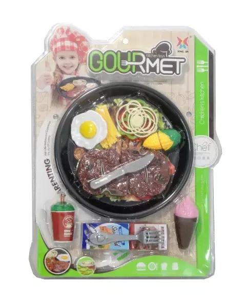 W komplecie otrzymujesz różne pokarmy na talerzu, takie jak: steki, jajka na miękko, frytki, kolby kukurydzy oraz kawałki cebuli i pomidora. W zestawie wyposażonym dodatkowo w sztućce, lód i shake. Zabawka jest zapakowana w przejrzyste opakowanie. Przeznaczona dla dzieci w wieku powyżej 3 lat. Podane wymiary dotyczą wymiarów opakowania.EAN: 5902496183531