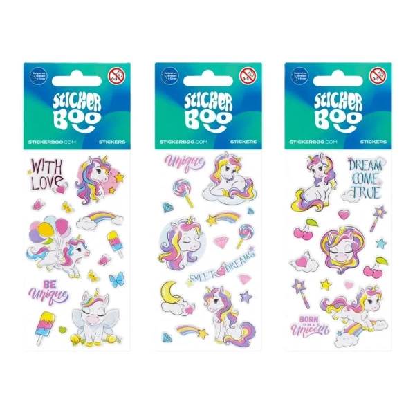 Naklejki marki STICKER BOO z motywem Jednorożca na pewno wpadną w oko Twojemu dziecku. Są idealne do personalizowania rysunków, wszelkiego rodzaju prac kreatywnych oraz do zbierania. Możliwe do zakupu w trzech różnych wersjach graficznych.