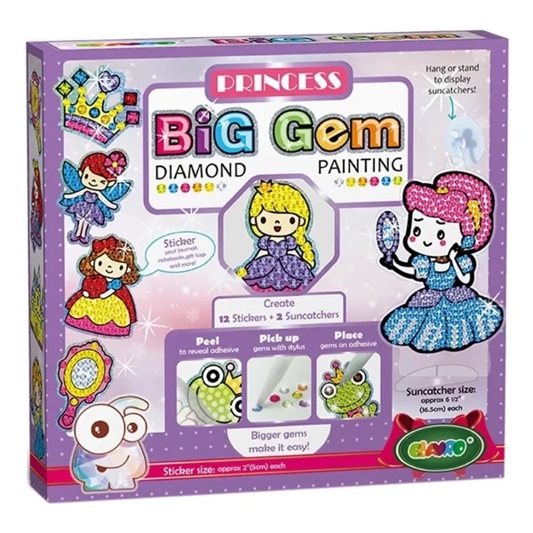 W tym zestawie znajdziesz 14 atrakcyjnych wzorów do wyklejania Twojej ulubionej księżniczki. Ponadto, znajduje się tam zestaw woreczków z różnokolorowymi, błyskotliwymi diamencikami. Do nakładania kolorowych kamyków dołączono plastikowy patyczek, a także kostkę do woskowania, która przyda się podczas pracy nad projektem. Dodatkowo, zestaw ten zawiera również stojaczki i przyssawki, które umożliwiają łatwe i wygodne przechowywanie wszystkich elementów. Całość jest zapakowana w estetyczne opakowanie o wymiarach 25 x 24 x 5 cm.
