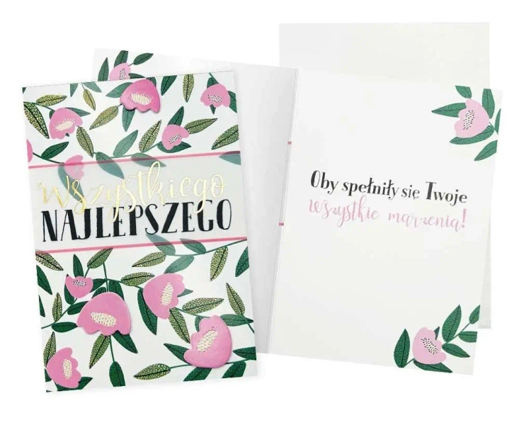 Cechy karty które wyróżniają ją na tle innych to jej rozmiar: B6, 16.6 x 11.7 cm po złożeniu. Karnet zawiera także kolorową kopertę, która dodaje uroku całemu zestawowi. Ale to, co naprawdę wywołuje uśmiech na twarzy, to zdobienia. Są one kolorowe, różnorodne i wyrafinowane, momentami niemal jak drobiny biżuterii. W zależności od konkretnego modelu, mogą one obejmować naklejane dekoracje, elementy biżuteryjne, odstawniki, błyszczące metaliczne folie czy artystyczne tłoczenia. Każdy element dodany jest z myślą o stworzeniu niezapomnianej karty, której nie da się przeoczyć.