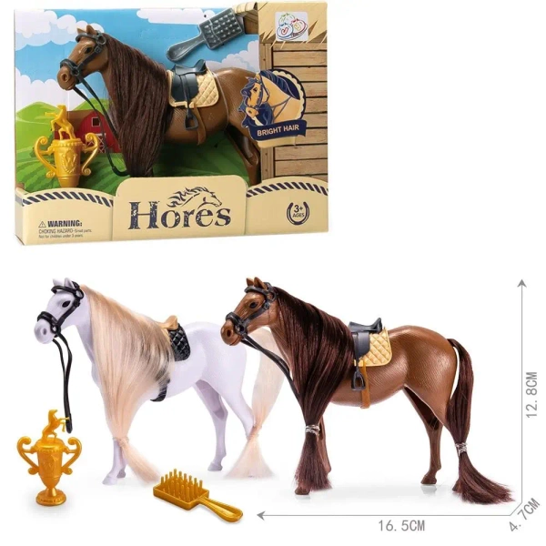 Oferujemy zestaw zawierający konika z przepiękną, długą grzywą, dobrą do czesania, wraz z dołączoną szczotką do jej pielęgnacji. Zestaw uzupełnia również trofeum zwycięskie. Zapewniamy, że koń jest dostępny w dwóch gustownych barwach - czystej bieli i eleganckim brązie. Wysokość konika to 13 cm, a wymiary opakowania to 19.5 x 5 x 14.5 cm.