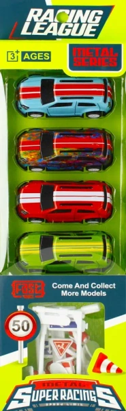 O szczegółachProdukty są w większości metalowe, co zapewnia ich wyjątkową trwałość, nawet w najbardziej ekstremalnych wyścigach. Zestaw zawiera cztery auta oraz różnego rodzaju akcesoria drogowe.