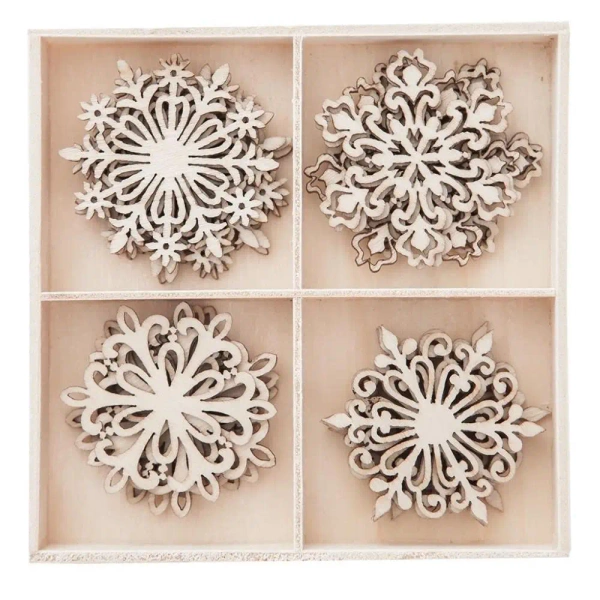 Śnieżynki są wytworzone z drewna będą doskonałym uzupełnieniem wszelkich ozdób na święta. Można zastosować je do dekorowania kartek, albumów oraz ozdobienia wnętrza domu. Wprowadź zimowy wystrój do swoich projektów za pomocą tych oryginalnych elementów. Co więcej, masz pełną swobodę co do ich dekoracji - możesz je pokryć farbą, złoceniem (hot stamping), czy też pozostawić w ich naturalnej formie.