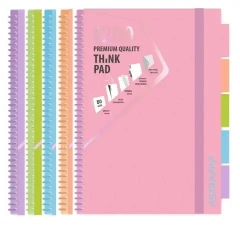 Przedstawiamy kołozeszyt ASTRAPAP Pastel w formacie A5. Produkt charakteryzuje się różnorodnością kolorów, które są mieszane w sekcjach notatnika.