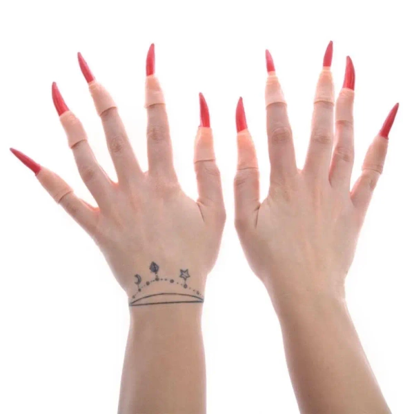 Zaakcentuj swój strój czarownicy za pomocą specyficznych dla jej obrazu długich paznokci - to kluczowy element kreacji. W zestawie otrzymasz 10 sztuk aplikacji na dłonie, które naśladują długie szpony wiedźmy. Możliwy kolor do wyboru to albo mroczna czerń, albo tajemnicza czerwień. Wielkość jednej aplikacji to 5-6 cm.