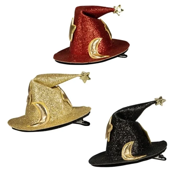 Dodaj odrobinę magii do swojego stroju z tą wyjątkową, brokatową spinką do włosów z czapką czarownicy. Ta mała, połyskująca czapeczka jest przystrojona złotymi aplikacjami w formie księżyca i gwiazd, co dodaje jej uroku. Dostępna jest w trzech kolorach do wyboru: wibrującym czerwonym, głębokim czarnym lub zawsze eleganckim złotym. Spinka do włosów utrzymuje czapkę pewnie na miejscu, zapewniając wygodę przez cały dzień, a jej unikalny wygląd sprawia, że stanowi świetne uzupełnienie stroju na bal przebierańców, zabawę tematyczną czy Halloween.