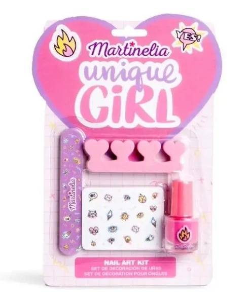 Skład zestawu kosmetycznego dla dzieci obejmuje lakier do paznokci, separator oraz naklejki.