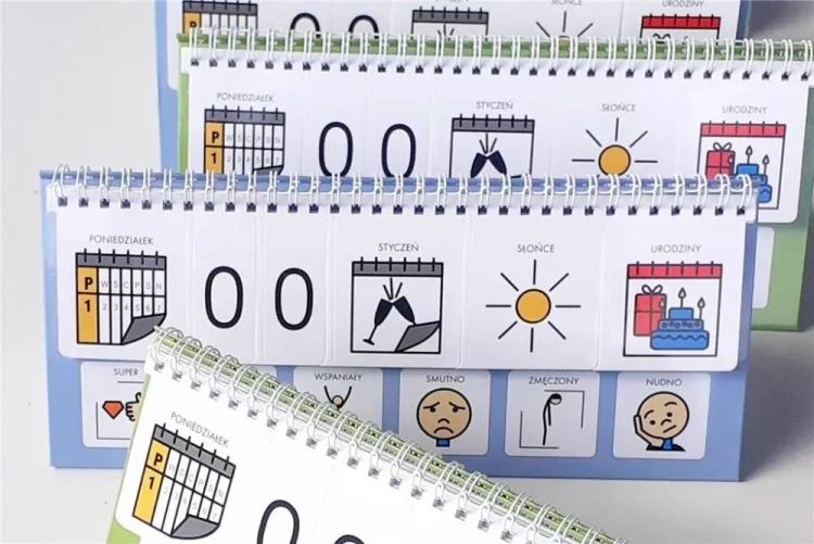 Z drugiej strony kartoniki układają się w zdania w zależności od ustawionej daty. Zdania są śmieszne i niekiedy absurdalne. Pobudzają wyobraźnię i są sposobem urozmaicenia terapii oraz zachęcenia do samodzielnego tworzenia wypowiedzi. Zdania można również dowolnie układać niezależnie od daty. Na podstawce znajdują się symbole do komentowania.