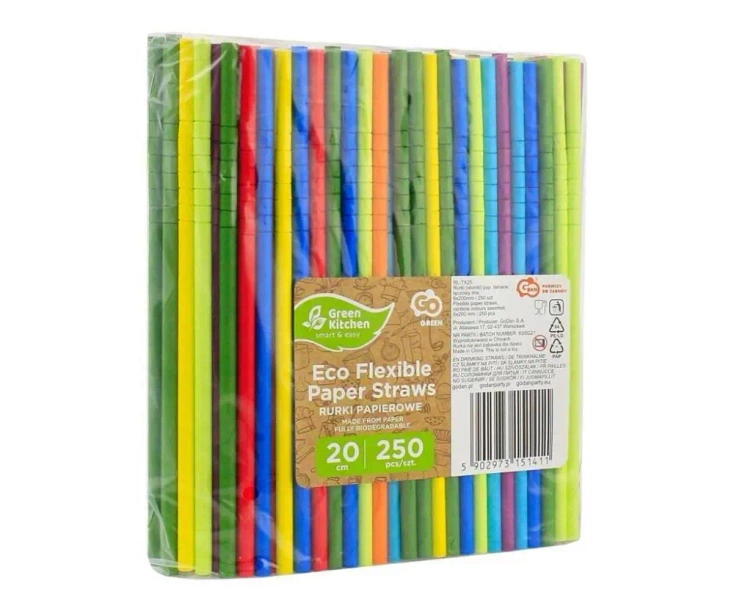 Poznaj naszą kolekcję GoGreen i odkryj słomki do picia, wykonane z papieru. Kolorowe i łamane, idealne do każdego napoju. Każda z nich ma długość 20 cm i średnicę 0,6 cm, co sprawia, że są niezwykle praktyczne. W jednym opakowaniu znajduje się aż 250 sztuk, dzięki czemu starczą na długie tygodnie użytkowania. Odkrywaj ze smakiem - wybierz nasze wielokolorowe słomki papierowe.