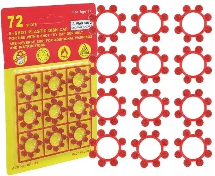 W skład tego atrakcyjnego zestawu dla małych miłośników gier strzelankowych wchodzi 9 plastikowych dysków, z których każdy posiada osiem naboi. Są one doskonale kompatybilne z różnymi modelami pistoletów i rewolwerów dla dzieci, które mają miejsce na ładowanie amunicji 8-strzałowej. Kapiszony są wykonane z plastiku, co gwarantuje bezpieczeństwo podczas zabawy. Produkt jest przeznaczony dla dzieci powyżej 3. roku życia.EAN: 5902539154986