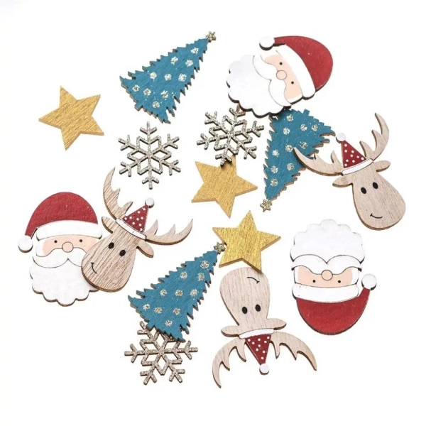 Każde opakowanie zawiera 15 sztuk różnorodnych, drewnianych motywów świątecznych. Znajdują się w nich: gwiazdki, renifery, postacie Mikołaja, choinki oraz śnieżynki.
