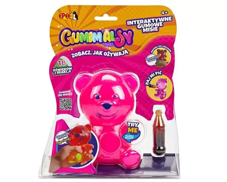 W zestawie znajduje się jeden Gumimals, jedna butelka z colą oraz instrukcja. Co ważne, baterie są już załączone w zestawie, a opakowanie wynosi try-me, czyli możesz go wypróbować już przy zakupie. Bez wątpienia, Gumimalsy to idealny prezent dla najmłodszych, ale także dla dorosłych wielbicieli gumisiów!EAN: 8411936720047