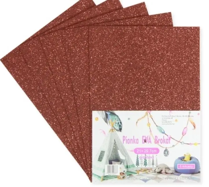 Prezentowany przedmiot to pianka brokatowa w kolorze grafitu. Wyroby z tego materiału charakteryzują się nie tylko swoją praktycznością, ale przede wszystkim efektownym wyglądem. Wymiary jednej arkusza wynoszą 21x29,7cm, co jest idealne do różnego rodzaju prac manualnych. Produkt sprzedawany jest w pakietach, każdy z nich zawierający 5 sztuk arkuszy.