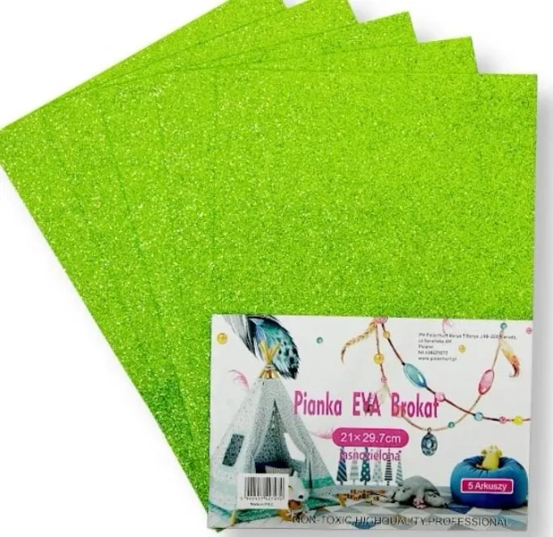 Rozświetlając pomieszczenie swoim jasnozielonym kolorem, ta brokatowa pianka prezentuje się wyjątkowo atrakcyjnie. Oferowana w zestawie składającym się z 5 arkuszy, posiada wymiary ok. 21x29,7 cm każdy.