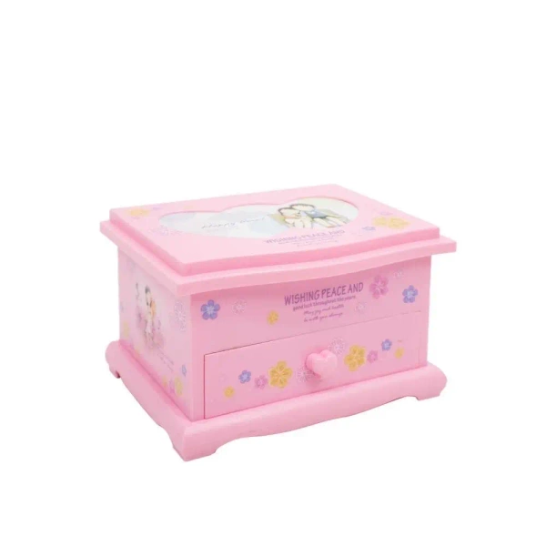 W skład produktu wchodzi: - wbudowane lusterko - trzy specjalne przegródki na biżuterie takie jak pierścionki czy sygnety - pokrętło znajdujące się pod pozytywką – po jego nakręceniu oraz otworzeniu szuflady, uruchamia się muzyka. Nie jest wymagane do tego użycie baterii. - szuflada na biżuterie , która jest zalecana dla dzieci, które ukończyły już 3 rok życia.