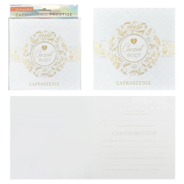Każde opakowanie zawiera 5 sztuk naszych ekskluzywnych zaproszeń na chrzest wraz z dobranymi do nich kopertami. Wielkość zaproszeń wynosi orientacyjnie 14,5 x 14,5 cm. Na specjalnej wkładce z tyłu każde z zaproszeń znajduje się tekst. Jest to dopełnienie eleganckiej całości zaproszenia na tak specjalną okazję, jaką jest chrzest.
