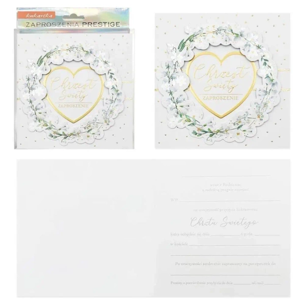 Produkt to zaproszenie na chrzest, które wyróżniają: doklejane elementy dekoracyjne, przestrzenne tłoczenie oraz co najmniej dwa dodatkowe elementy uszlachetniające każde zaproszenie, jak np. folia lub brokat. Rozmiar zaproszenia to około 14,5 x 14,5 cm. W opakowaniu znajduje się 5 sztuk zaproszeń z dopasowanymi kopertami. Produkt jest idealny na okazję taką jak Chrzest.