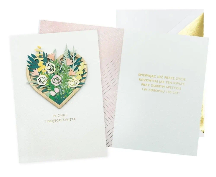 Karnet z okazji urodzin SCH-006 jest częścią stylowej kolekcji Signature Cards. Mimo swojej niewielkiej wielkości, zawsze przyciąga uwagę swoją żywą kolorystyką i oryginalnymi zdobieniami. Szczególnie wyróżniające cechy to: rozmiar B6 po złożeniu (16,6 x 11,7 cm), dopasowana koperta wliczona w cenie i ozdobiona metaliczną folią. Dekoracje są różnobarwne i różnorodne, oferując duże bogactwo – od przestrzennych dekoracji po brokat, metaliczne folie, czy tłoczenia, a wszystko to zależy od konkretnego wzoru. Ten karnet jest idealnym wyborem na prezent urodzinowy.